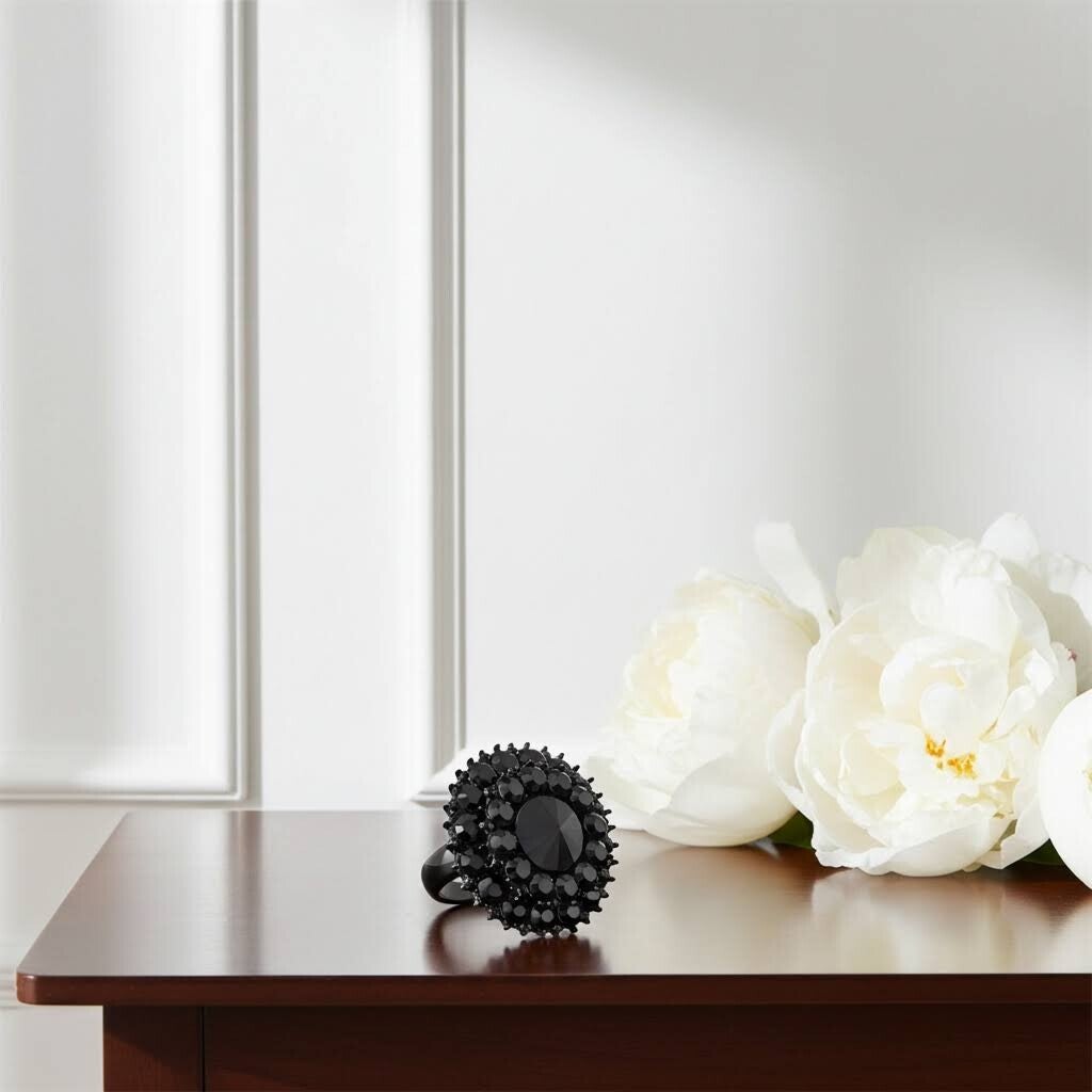 Introducing our stunning Large Black Floral Rhinestone Statement Ring! This captivating piece features a striking black stone centerpiece, surrounded with smaller black rhinestones. Elevate your jewelry collection with this bold and glamorous accessory.