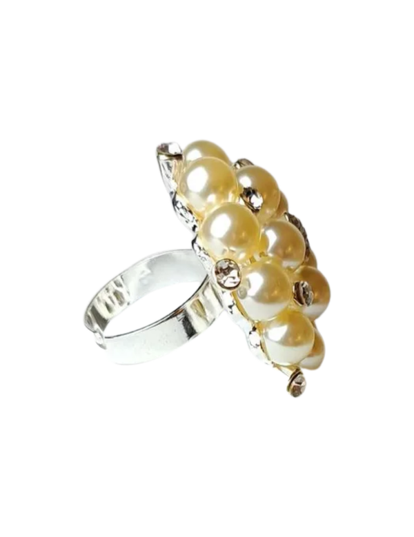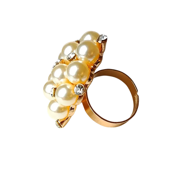 Introducing our Stunning Faux Pearl Statement Ring, the perfect way to upgrade your ring game! This amazing ring features beautiful white faux pearls surrounded by a sparkling array of faux diamond accents. The eye-catching design of this ring is sure to turn heads and add a touch of elegance to any outfit. Crafted with high-quality materials, this ring is both durable and stylish, making it the perfect accessory for any occasion. Whether you're dressing up for a special event or simply adding some glamour to your everyday look, our Faux Pearl Statement Ring is the perfect choice. Order yours today and experience the beauty and luxury of fine jewelry!