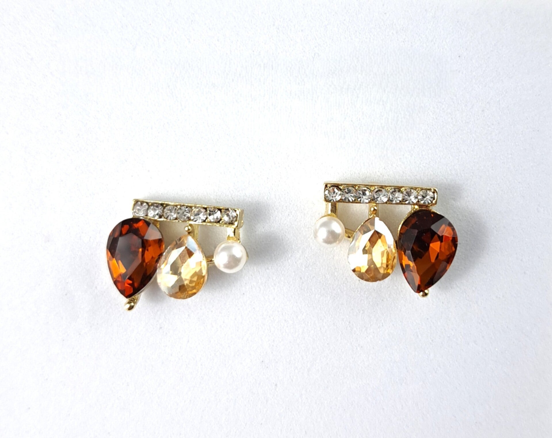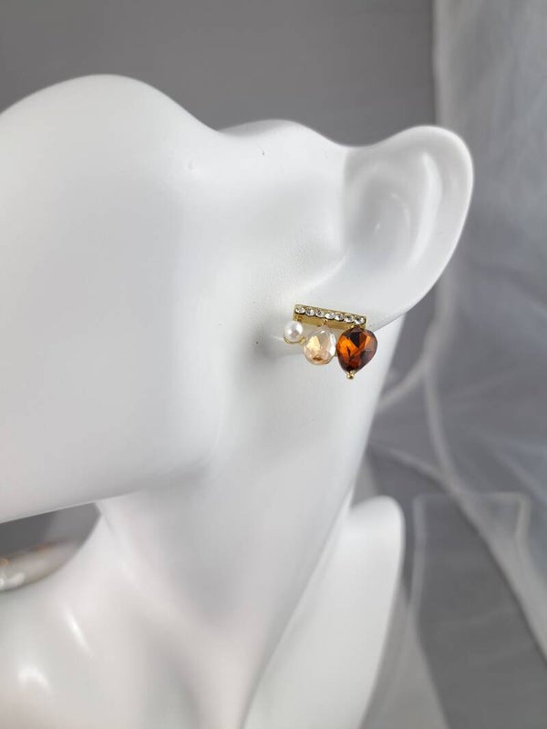 A curated cascade of warmth and light. These earrings feature a rhinestone-studded gold bar from which fall three hand-selected charms: a rich amber teardrop, a champagne gem, and a luminous pearl all accented with a gold-tone finish. Designed for the discerning eye, Amber Grove is a celebration of golden hour in wearable form.