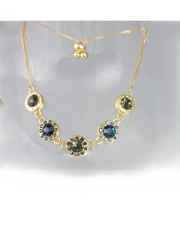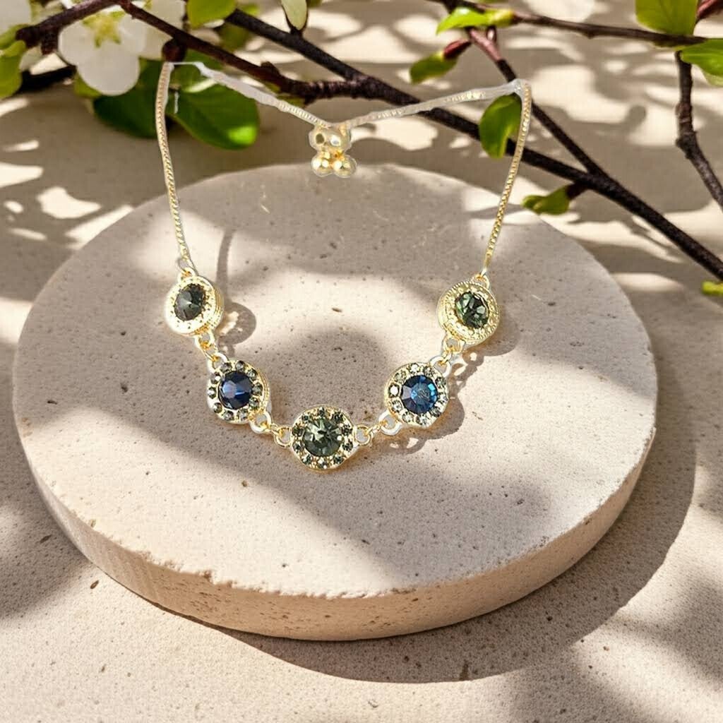 Add a pop of color to your wrist with our Blue and Green Circles Bracelet! This stunning gold piece features five vibrant stones for a fun and stylish look.